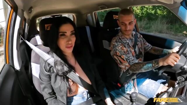 Description: I picked up Goran Abramovic for his driving test, and he waved goodbye to his girlfriend as we drove away. Blond, moustached Goran was very nervous and kept making mistakes, and I noticed him checking out my huge tits. I told the inked-up stud that I had one final test for him: I had to examine the size of his cock! He whipped it out and I was pleased by how big it was. I sucked Goran's rock-hard gearstick, then took control by climbing on top to ride him cowgirl in the driver’s seat. While we were getting jiggy, Goran’s girlfriend, Jennier Mendez, suddenly confronted us! Jennifer tried climbing through the window but got stuck, so Goran hopped outside to eat Jennifer’s ass and pussy while I played with the hot brunette's big fake boobs! Jennifer and I treated Goran to a double blowjob, then he pounded Jennifer in the spoon position. It was my turn to get fucked by Goran doggystyle, and after riding his cock some more, he showered Jennifer with his cum in a sticky finish!