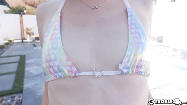 Description: Maria is relaxing by the pool at a home share when two of her friends arrive. She teases them both before inviting them inside for a threesome.