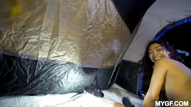 Description:Sarah Lace wants to do a fun camping nighttime camping trip in the wild. She pitches a tent and gets him nice and hard before stripping down in front of the fire and showing off her perky nipples. She sucks his cock before asking him if he wants a taste of her perfect pussy. She rides his cock with the tent door open and moans with pleasure as he stretches her tight teen pussy!