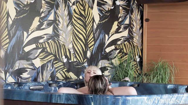 Description: Cute platinum blonde Miss Melissa is relaxing in the jacuzzi while stunning Blue Angel has fun in the pool, as Sandra Shine’s hot lesbian movie "Drenched" begins. Angel surprises her girlfriend with a tender kiss, joining her in the water and embracing her passionately. She sucks Melissa’s stiffening nipples, turning her on, and strokes her smooth shaved pussy, spreading open her juicy pussy lips like exotic butterfly wings. Rubbing and licking Melissa’s clit, Angel uses all her oral skills to drive her to a powerful orgasm. Now the horny beauty sits on the edge of the tub with her thighs spread wide so Melissa can eat her soaked pussy, sucking her clit and lapping at her succulent slot. She turns over to let her girlfriend eat her from behind, making her climax with a gasp of pleasure.