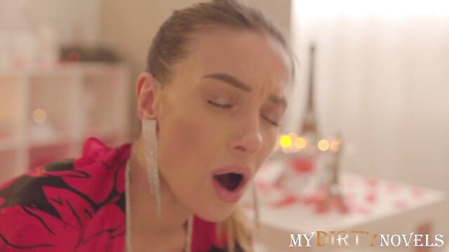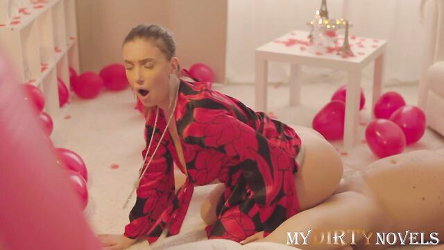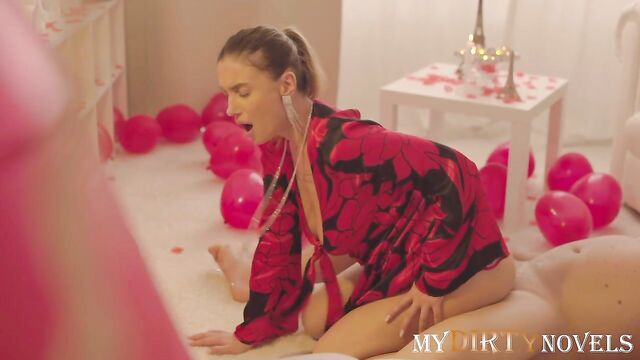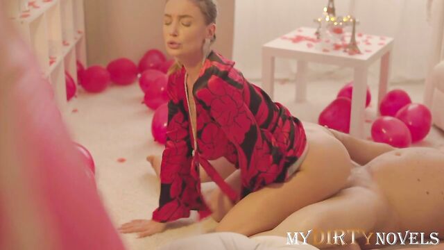 Description: On Valentine's Day I put on new sexy panties and a dress. Sam was sitting in a decorated room and waiting for me. I showed panties and masturbated in front of him, gave him a blowjob. Then I cowgirl his cock and rode. He was so excited that he came inside me. A wonderful holiday.