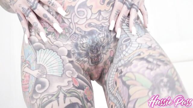Description: That's an understatement! Inked beauty Tigerlilly makes her Hussie Pass debut this week, and we paired her up with our good friend Damion Dayski for this week's tattooed interracial MILF update! Director Johnny Robins kicks things off by interviewing the 30-year-old Native American from Texas, followed by Tigerlilly shedding her skimpy bikini, showing off all her tats, and then warming up her trimmed snatch, first with her fingers and then with a rather large translucent rubber DONG! Damion makes his way into the scene with some lube for Tigerlilly's ample breasts and for her juicy backside, which she then twerks for us. Tigerlilly then gets on her knees for the big reveal, followed by her sucking and slobbering on Damion's big dick. She lets Damion titty-fuck her for a bit and gives him a footjob before Damion repays all the oral treats he's received by going down and suckling on her slit. Then he put it in! Tigerlilly takes ALL 12 inches of Damion while spread-eagle, then reverse cowgirl, cowgirl, airborne, and doggystyle until he pulls out and cums on her pretty little face. We followed the two of them into the shower afterward for a quick interview.