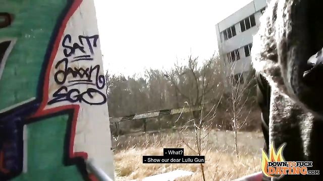 Description: Petite brunette Lullu is already sucking one guy's dick outdoors at an abandoned building when the other guy shows up. She gives them both a bj, and they take turns fucking her until they cum all over her ass.