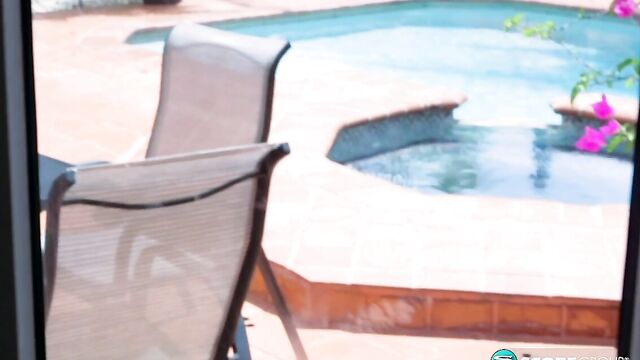 Description: Vee VonSweets has a perfect bod for bikinis and extreme swimsuits like slings, thongs, microkinis and other styles of suits that have less fabric than a handkerchief. This scene is the proof. It's a beautiful day in Florida, and after oiling at poolside, Vee heads inside to show you more of her sexy physique. SCORELAND: Has a bra ever popped open on you in the middle of the day? Vee: No. Most of the time my bras are good. The ones that hook in the back, sometimes my nipple will pop out because the cup doesn't actually cover it. Front-loaders are more secure. SCORELAND: You'll be walking around and your nipple will pop out? Vee: Sometimes. Not all the time. It's really hard for me to find bras in my size. A lot of times if I go to Victoria's Secret, I'll buy something that almost fits. I'll squeeze my boobs in there, but they're not the right size, so that's probably another reason they pop out. SCORELAND: I can't imagine you in a Victoria's Secret bra. They're so small. Vee: Oh, they have a few. I can squeeze myself into double-Ds. I have all different kinds of bras and all different sizes, but my correct size is 32G. SCORELAND: If we saw you out and about in the Carolinas, maybe shopping at the mall, what might you be wearing? Vee: Most of my clothing, because I have a small waist, I have to wear a lot of tight stuff. Stretchy things. I have a lot of tank tops and I'll wear tank tops and high heels and jeans.