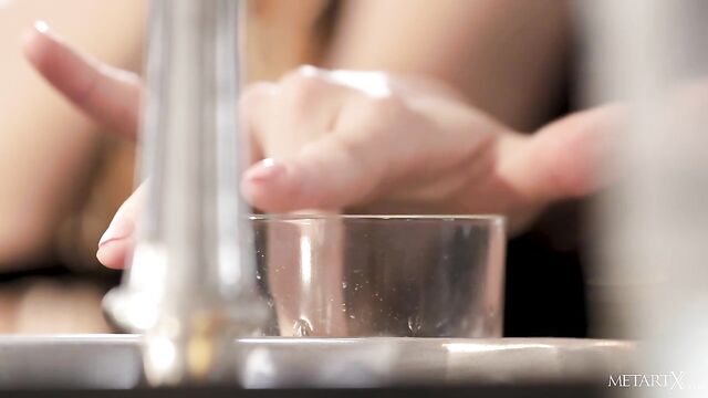 Description: After sexy blonde Zazie takes a drink and destroys a break-up letter from her lover, she sets about consoling herself with some solo lust action. As the hot Hungarian honey rubs one of her erect nipples with an ice cube, it causes her arousal level to rise, so she fondles her beautiful, firm breasts while simultaneously stroking between the legs. She slips off her panties, bends over the dining table, slides a hand between her thighs, and frigs her shaved pussy frantically. Facing front, she bends backward over the table and resumes her wild finger play, moaning with pleasure as she races towards an almighty climax.