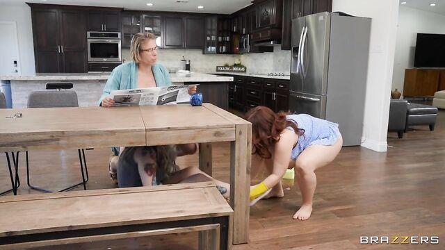 Description: Natasha Nice and Mick Blue are enjoying some new marital bliss and fucking right on the kitchen table. That’s when Mick’s son and his new girlfriend, Kaiia Eve, arrive home from college for a surprise weekend stay. Mick’s son is real prude, but Kaiia is thirsty for a fuck and concocts a plan to get access to Mick’s dick, quick. Kaiia, with pussy dripping, crawls under the table and cuts a gloryhole in Mick’s newspaper. Natasha comes in to find Kaiia’s wet mess and gets down on her knees to scrub it up. That’s when she discovers Kaiia sucking her man’s cock. Natasha doesn’t get mad, she gets scissor happy and yoinks Kaiia out of the room and into the bed for some hot girl-on-girl action. Mick joins and gladly fucks both the ladies and cums in their faces. Mick, you got some explaining to do!